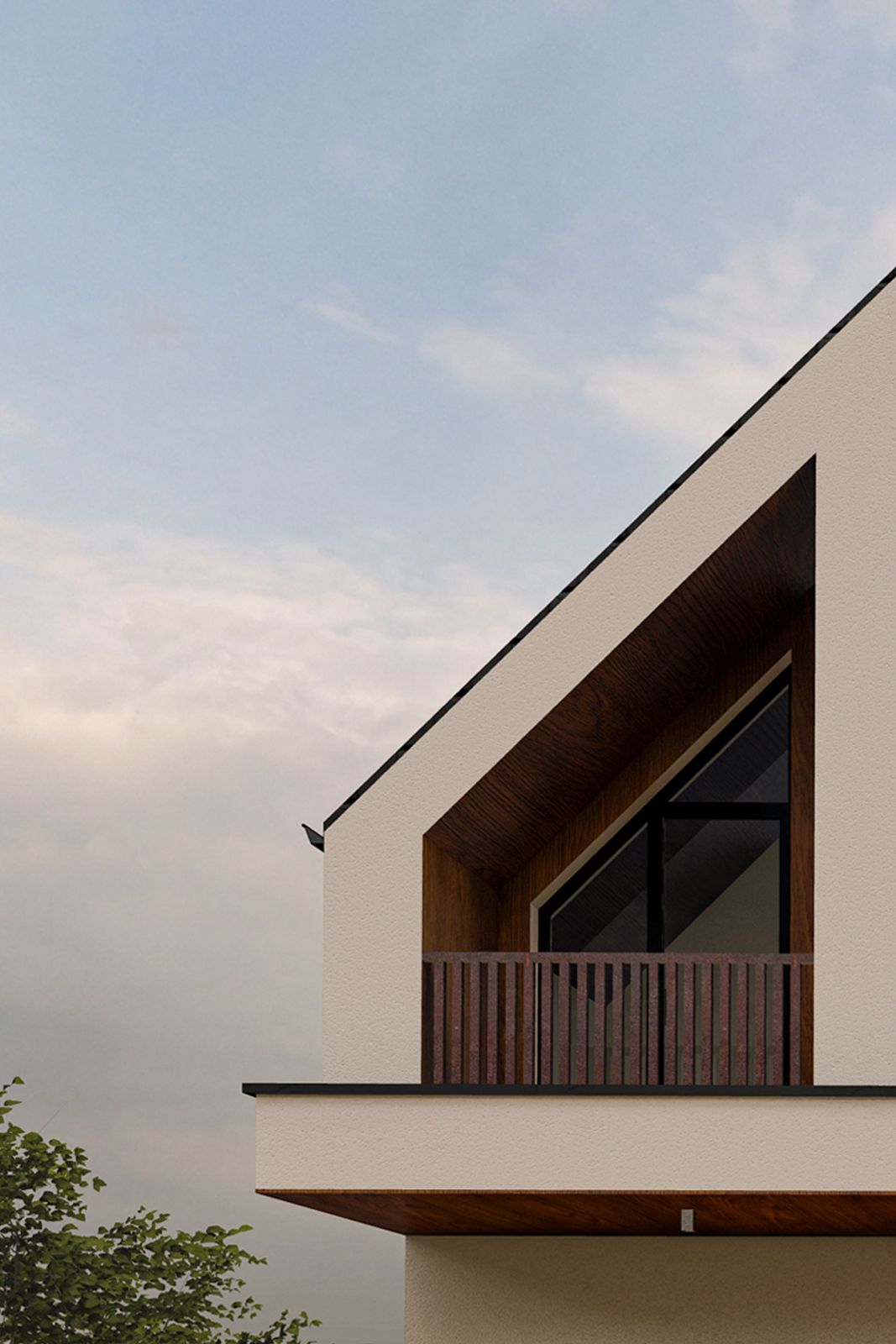 La nivelul superior, fațada devine mai permeabilă vizual prin intermediul suprafețelor vitrate de mari dimensiuni. Loggia retrasă, placată cu lemn, creează un spațiu semi-protejat, oferind intimitate și control solar, în timp ce panourile verticale din lemn funcționează ca elemente de filtrare a luminii și de protecție vizuală. Acestea adaugă profunzime fațadei și dinamizează compoziția, fără a încărca imaginea de ansamblu.